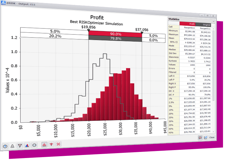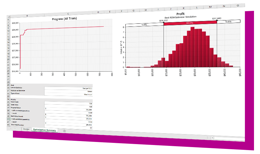 | Optimization under uncertainty | Combines Monte Carlo simulation with sophisticated optimization techniques to find optimal solutions to uncertain problems. Used for budgeting, allocation, scheduling, and more. | ![]() | ![]() |