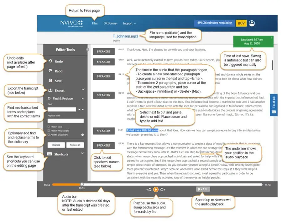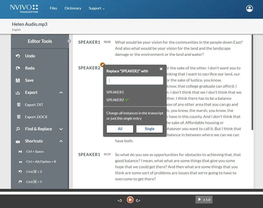 Our rich text editor lets you quickly review the automatic transcription, tag speakers, add notes and make changes as needed. You can then import the transcript directly into NVivo or export it for external use in either .docx or .txt formats allowing for a seamless video or audio transcript to edit workflow.