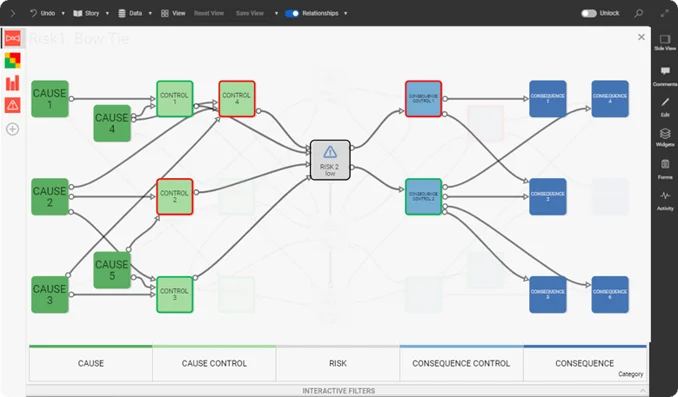 Static risk visualizations, like the bow-tie approach shown earlier, can be a good way to represent a brief overview of the current situation. However, for a more comprehensive ERM, a more in-depth approach is needed. Dynamic risk management software like Predict! allow users to dive in and out of data at will.