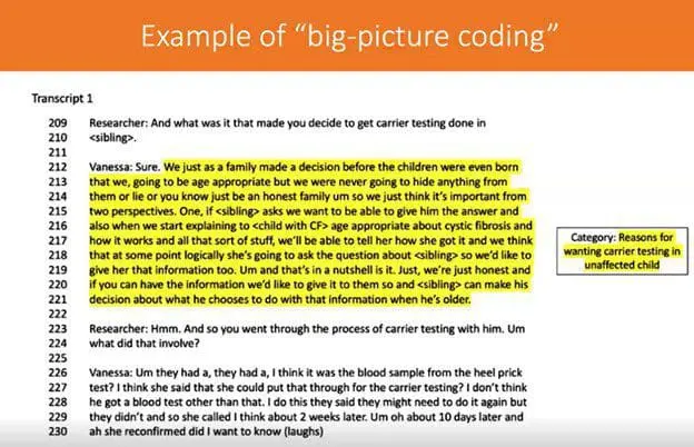 Researchers may choose to apply theory in interpreting the outcomes of ICA. For example, while studying views about genetic carrier testing of children, Associate Professor Vears shared that she used the concept of the “zone of parental discretion” after her initial ICA findings to interpret parents’ views on carrier testing for their children. This was done after inductive coding had been completed in order to provide a deeper understanding of the data.