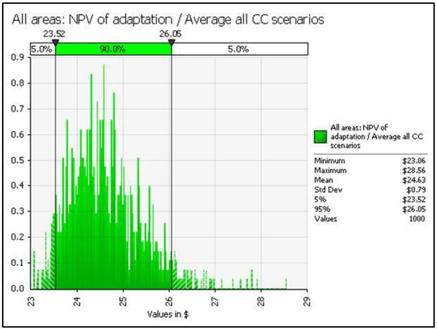 “We also had six possible adaptation measures,” Kinghorn explains. “These could be introduced at any time over the 90-year period and in some cases could be different scales. For example, it may only be worth investing in a levee which is 2.5m high rather than 3m high, as the probability of a higher flood event is sufficiently low as to not to justify the additional expenditure…This then helped us develop a portfolio of adaptation measures and the approximate timing as to when they should be introduced, so as to maximise the Net Present Value of adaptation,” says Kinghorn.