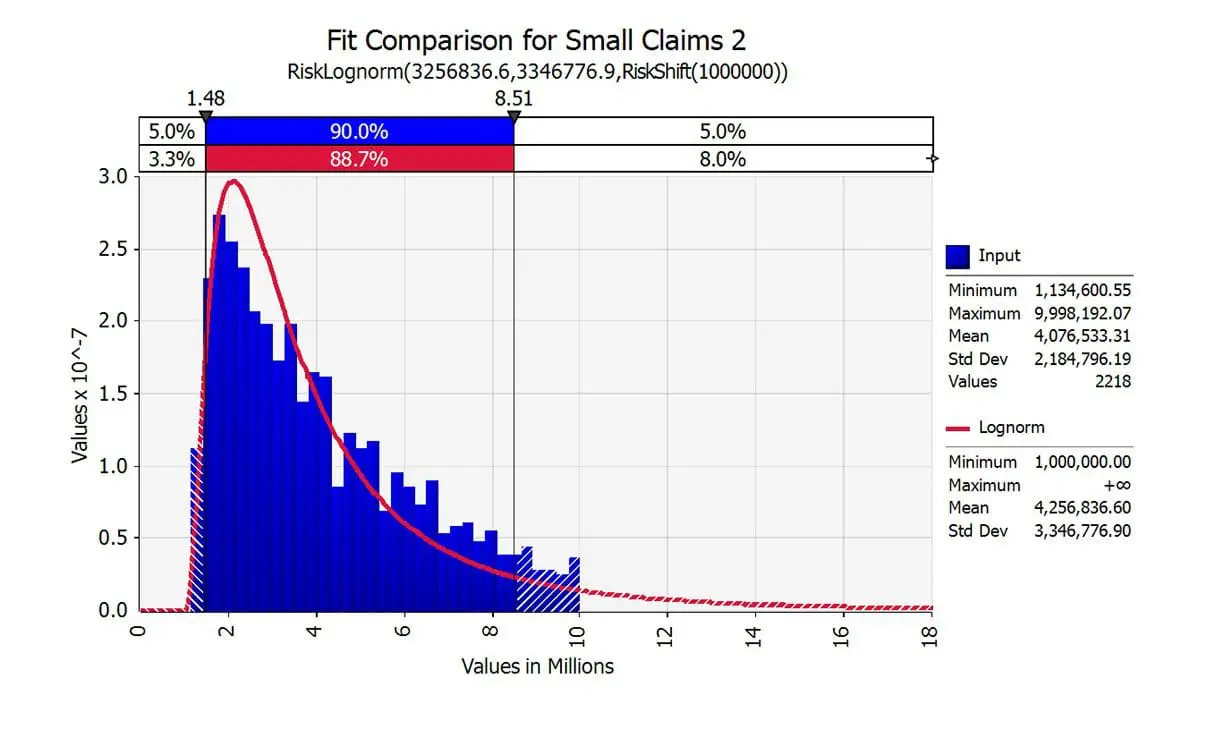 - For claims severity, heavily skewed distribution such as lognormal and Pareto are used. These provide a good representation of insurance claim sizes and adequately capture the possibly of large catastrophic claims.
