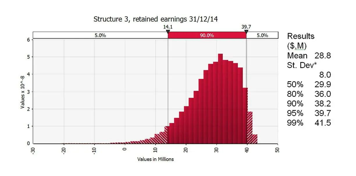To help its clients develop an informed risk management strategy, Alesco uses @RISK to design models that forecast future insurance losses. This enables alternative insurance structures to be tested to see how different balances of business unit retention (usually a simple deductible or excess on the policy that will be applied before any insurance claim is made), captive retention, and, beyond that, commercial insurance, affect premium levels and capital requirements. The objective is to find the optimal structure that balances an acceptable premium cost with the client’s financial ability to retain risk, and its appetite to do so.