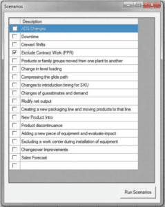 The industrial engineering team can run any individual scenario, or any combination, from the Scenario selection panel.