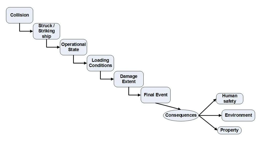 In the case of investigating the risk for a specific ship type, typically the overall risk model contains sub-models addressing five accident categories: collision; contact; fire/explosion; grounding; and foundering. Each sub-model describes the relationship between the initial incident (e.g. an accident such as a collision between two ships) and the consequences. These models are based on ‘high-level’ event sequences, as illustrated in Figure 1.