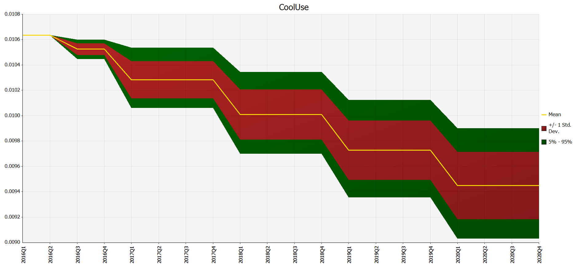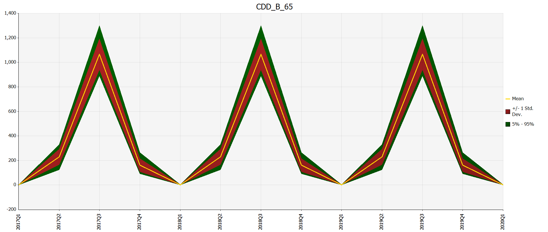 As the graph below illustrates, introducing weather variability into the model based on observed weather patterns allows the firm to gain perspective on how much their forecast would be expected to vary in any given period: