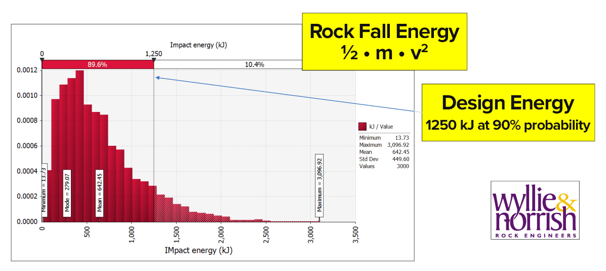 Modeling rock fall masses, trajectories, velocities, and energies to design rock fall protection structures. Communicating risk to clients by calculating impact energy probability so that the impact capacity of the protection structure can be matched to the consequence of an accident.