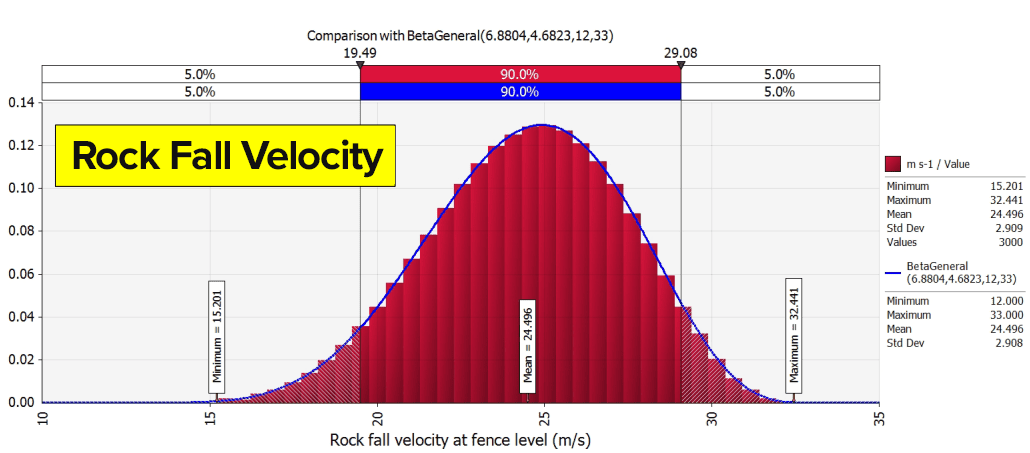 Wyllie found that the BetaGeneral and Pert distributions incorporated in @RISK provide the optimum models for these conditions. Multiplication of mass by the square of the velocity distributions gives the impact energy that is also defined by a probability distribution. This information can be used to design protection structures that reduce the hazard to an acceptable level of societal risk.