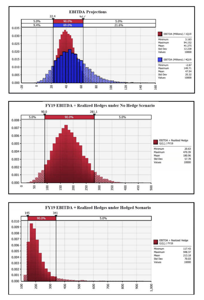 For the Bonanza Creek group, they ran 10,000 simulated scenarios and measured performance against the following measures: cash flow shortfall, exceeded debt capacity, and tripped covenants (i.e., scenarios in which their 12-month trailing Interest Coverage Ratio or Leverage Ratio fall outside the boundaries stipulated in the existing debt covenants). After running simulations, the students found that, in a case with no hedging of market exposure, Bonaza would experience a severe cash shortfall 1% of the time, exceed debt capacity 11% of the time, and trip the covenants 5% of the time.