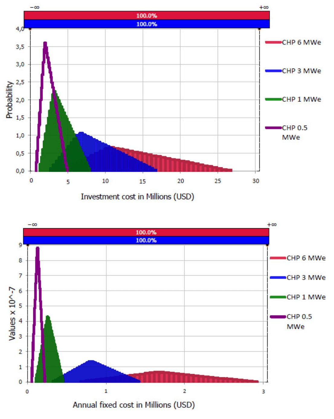 Figure 2 shows the probability distribution of NPV for CHP plants with capacities from 1 MWeq to 6 MWeq