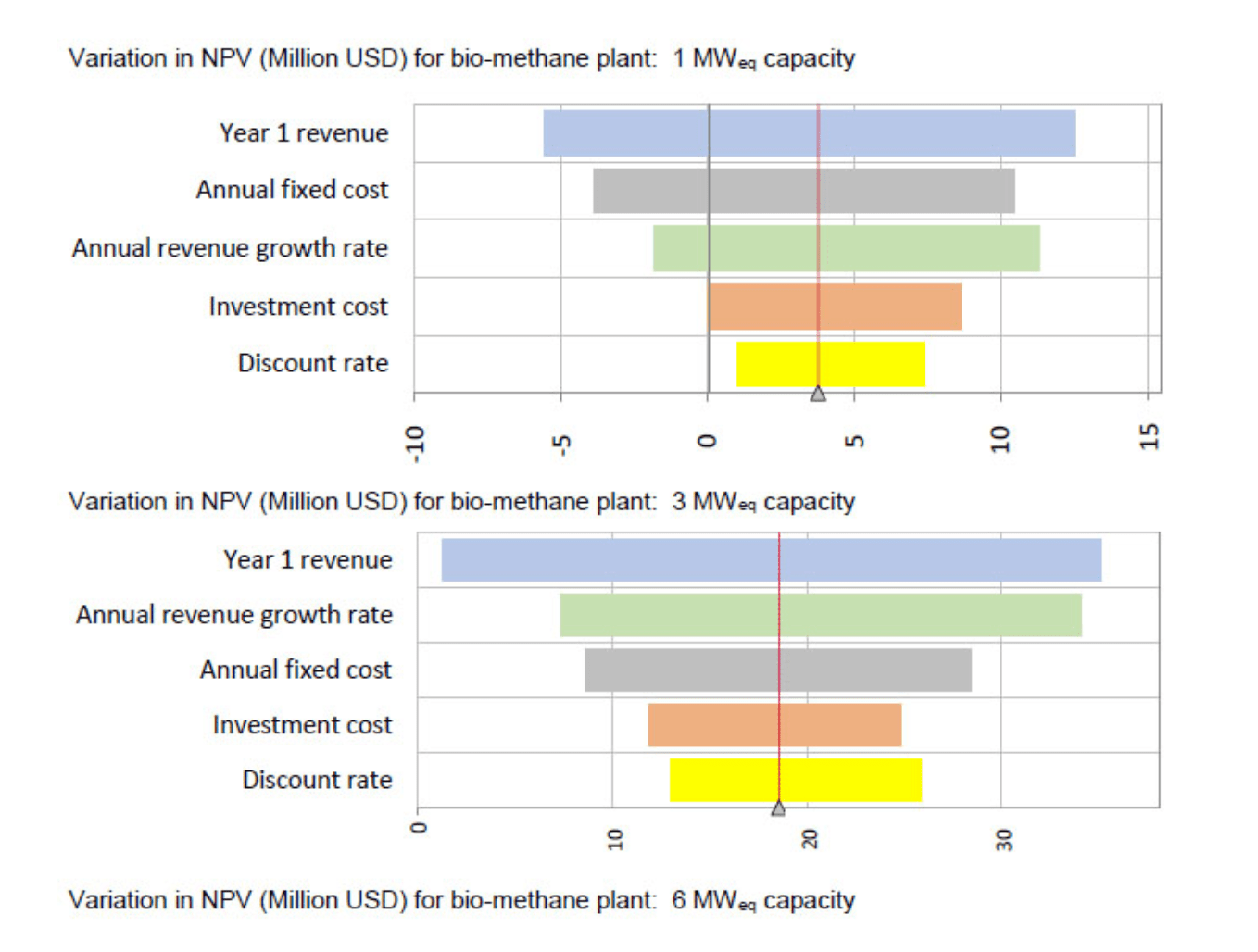 Most studies on the economic viability of biogas plants only consider traditional financial indicators like Net Present Value (NPV) and Internal Rate of Return (IRR). "This puts investors at the risk of overlooking the volatility of a project, based on uncertain events," says Nagel. "Risk-based decision criteria can aid in identifying and mitigating the most influential risks." To do this, Nagel used @RISK’s Monte Carlo simulation software to better examine the effects of parametric uncertainty on the financial viability of biogas plants in her home country, South Africa. The simulation analyzed 8 biogas plant scenarios varying in energy output (measured in megawatts electric, or MWe) from 0.5 MWe to 6 MWe plant capacity. The biogas usage pathways considered include electricity generation through a Combined Heat and Power (CHP) unit and upgrading of biogas to bio- methane for application as vehicle fuel.