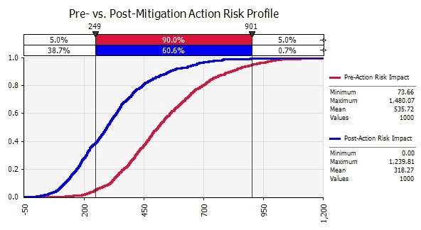 1. There are two figures that are typical outputs of this type of assessment: Probabilistic S-curve showing the risk profile (pre- vs. post-mitigation action) vs. probability value (percent confidence). This comparison shows the benefit of risk mitigation.