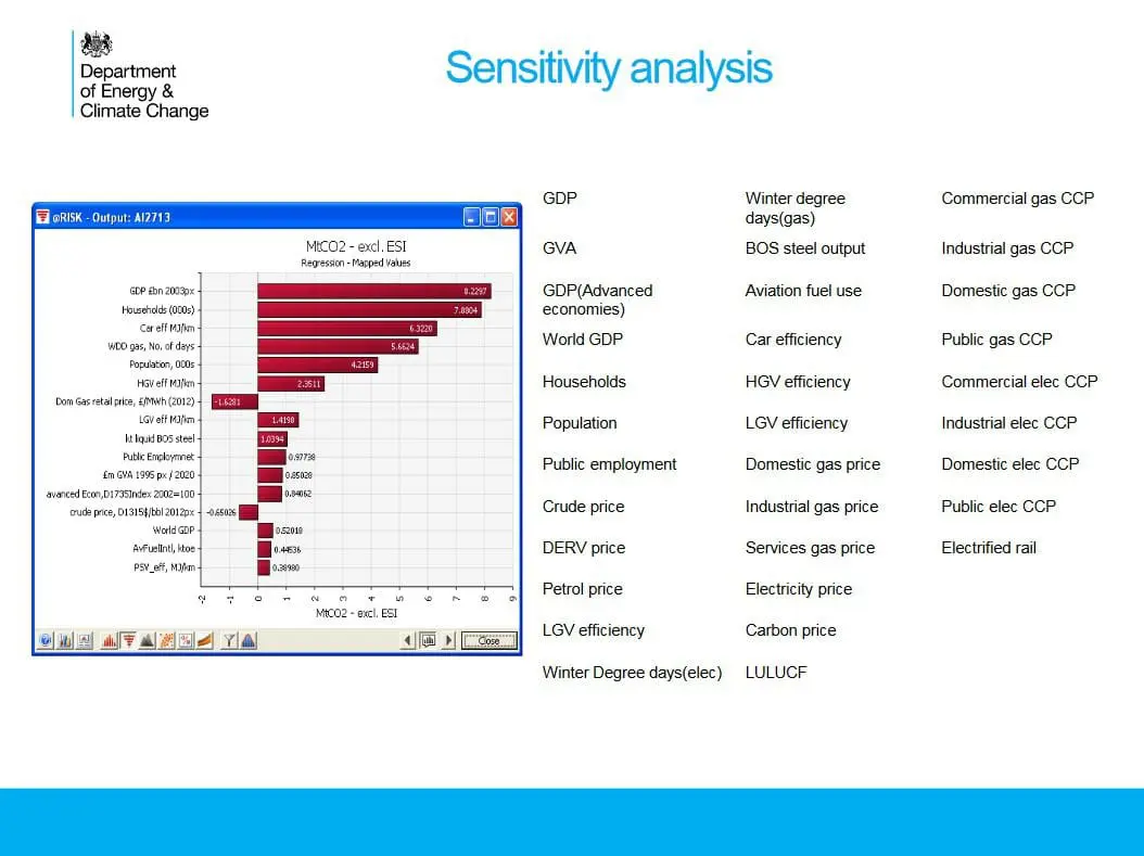 Using @RISK to create a Tornado diagram, the Central Modelling Team assesses how sensitive overall emissions are to changes in the values of selected input variables. This allows it to restrict the final Monte Carlo analysis to the variables that have the most impact on the UK’s emissions.