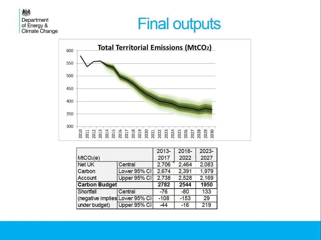 To monitor carbon budgets, the Central Modelling Team at the DECC undertakes annual projections of energy use and emissions by modelling both overall UK energy demand and the electricity supply system and calculating the emissions based on the fuels used. These projection figures are uncertain however, due to variation in each of the economic and technical inputs used in the models. DECC uses @RISK to explore the overall effects of these uncertainties and estimate the probabilities of not meeting the carbon budget.