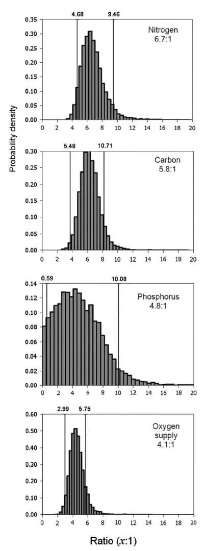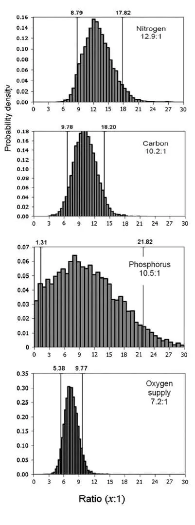 Figure 1: Weight ratios of the kelp, Alaria esculenta, required to sequester nutrients and supply dissolved oxygen per unit growth of Atlantic salmon (Salmo salar).