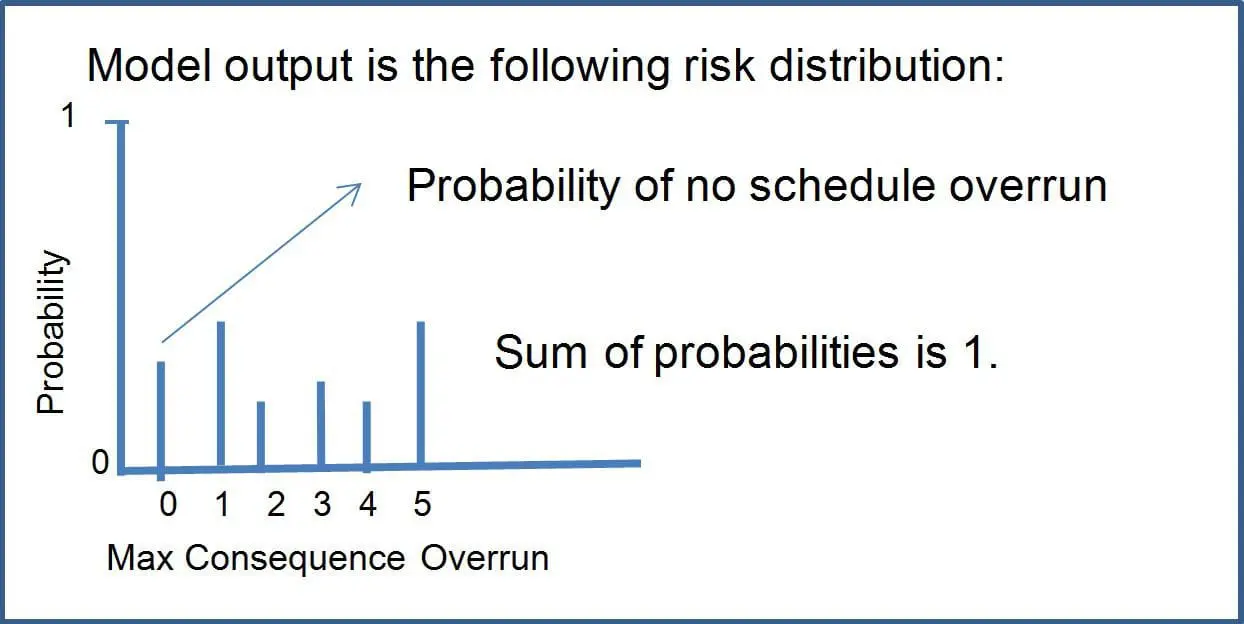 After running the integrated model, @RISK gives an output that tells the likelihood of not meeting the schedule, and the collection of maximum consequences from schedule overrun scenarios.