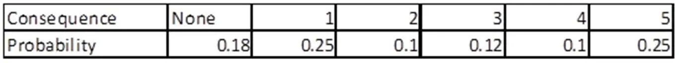 With schedule and cost variables in place Nierwinski then creates integrated outputs from the model, which will then, with several thousand iterations, create scenarios that involve an overrun or underrun, depending on the iteration. For overrun situations there are two sets of consequences, cost and schedule. Each set of consequences range from 1-5 (best-case to worst-case scenarios). A given simulated run will yield a cost and a schedule consequence. The maximum of the two consequences is selected for each simulated run. This is called the max consequence. If the target time is not exceeded for a given simulated run, then the max consequence is set to none or 0.