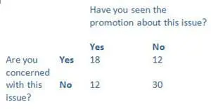 Here is an example from one of my books, where we concern ourselves with the relationship between having seen a promotion relating to a social or environmental issue and being concerned about it.
