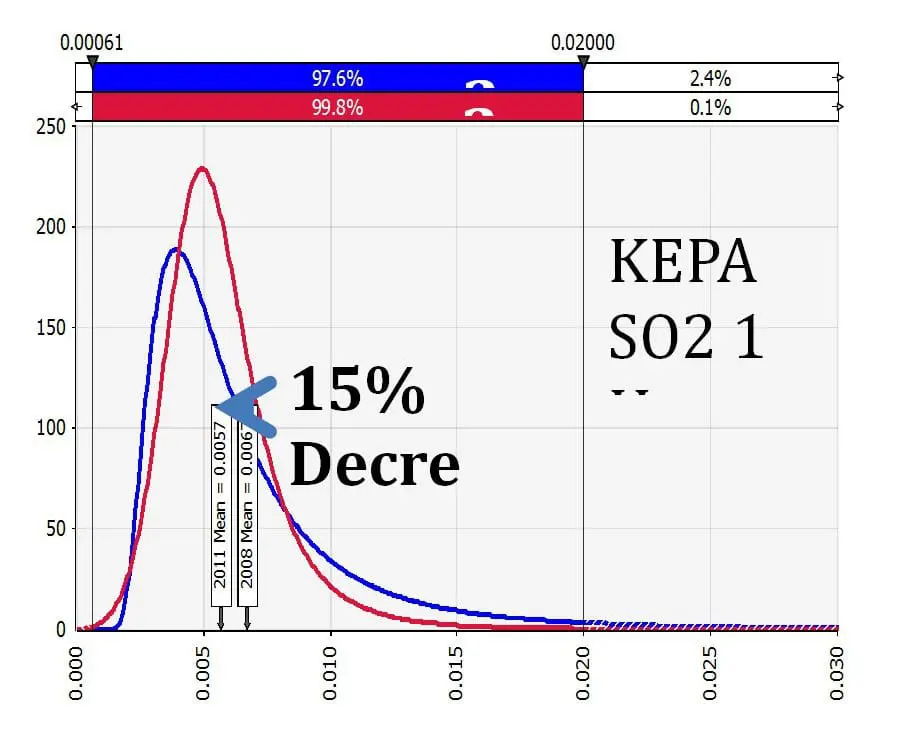 Results graphs demonstrate significant changes – Below is a model demonstrating the overall yearly improvement or deterioration of ambient air. In this case, overall SO2 has decreased by 15%.